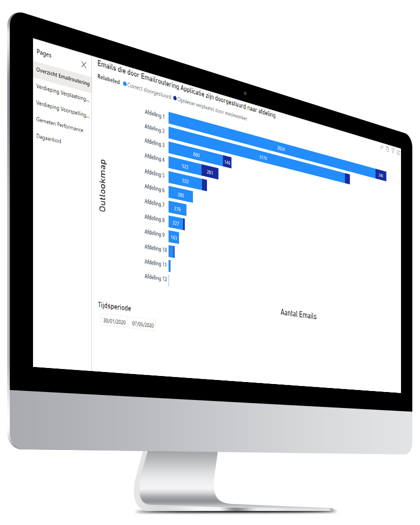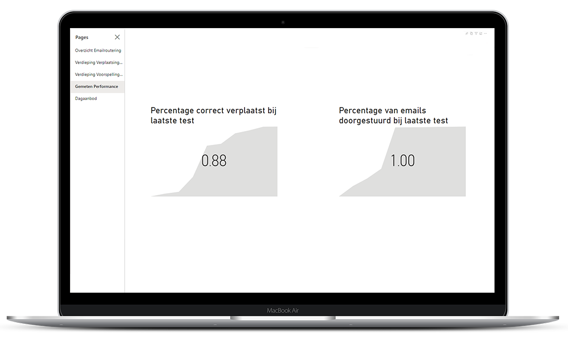Neben der automatisierten Zuordnung ist ein Power BI-Dashboard, das die Anzahl der weitergeleiteten E-Mails anzeigt, der zweite Eckpfeiler unserer Lösung. Das Dashboard zeigt auch an, wie oft dieser Prozess durch das KI-Tool korrekt ausgeführt wird und wann ein Mitarbeiter ihn manuell korrigieren musste. Das gibt Aevitae nicht nur die Möglichkeit zu überwachen, ob der automatisierte Prozess reibungslos läuft. Es hilft auch neue Einblicke in die Fragen, die ihre Kunden bewegen, zu gewinnen.