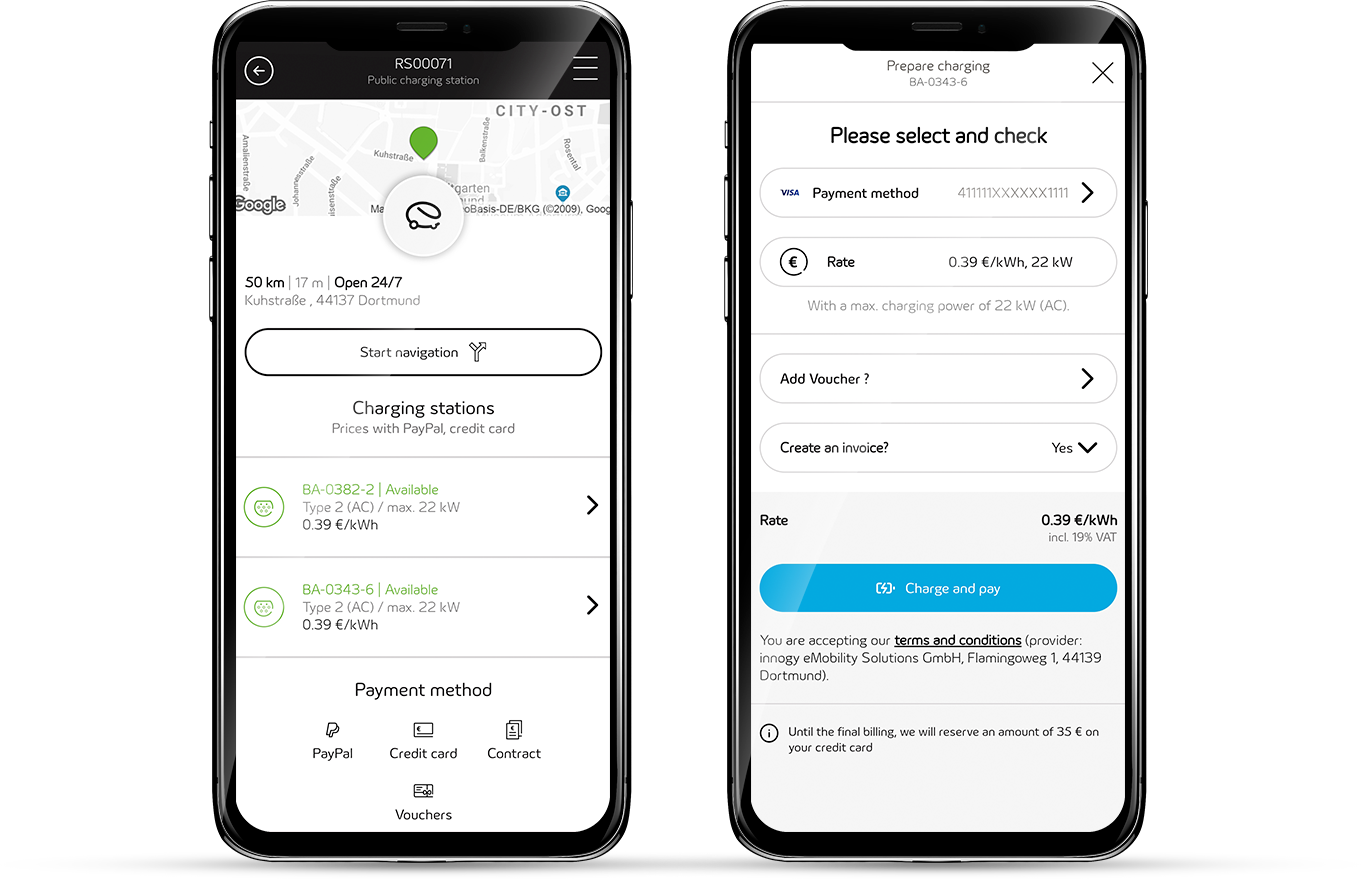 Die innogy eMobility Solutions’ eCharge+ App hilft Ihnen, die nächstgelegene verfügbare Ladestation für Ihr Elektrofahrzeug zu finden. Stellen Sie schnell und einfach Ihre bevorzugten Zahlungsmethoden, wie PayPal oder Kreditkarte, ein und schon kann es losgehen.